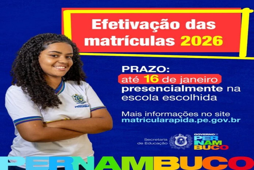 Começou nesta segunda-feira (05) a etapa de efetivação das matrículas da Rede Estadual de Ensino de Pernambuco para o ano letivo de 2026. O procedimento segue até o dia 16 de janeiro e deve ser realizado presencialmente na unidade escolar escolhida no cadastro on-line.