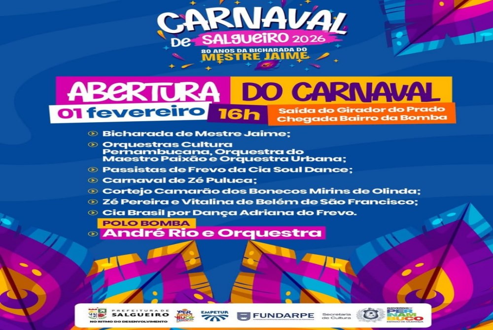 O arrastão cultural terá concentração no Girador do Prado, a partir das 16h, saindo rumo à Praça da Bomba, onde haverá show carnavalesco de André Rio e sua orquestra. Uma festa que fará a alegria de foliões de todas as idades, demonstrando o que será o Carnaval de Salgueiro em 2026.